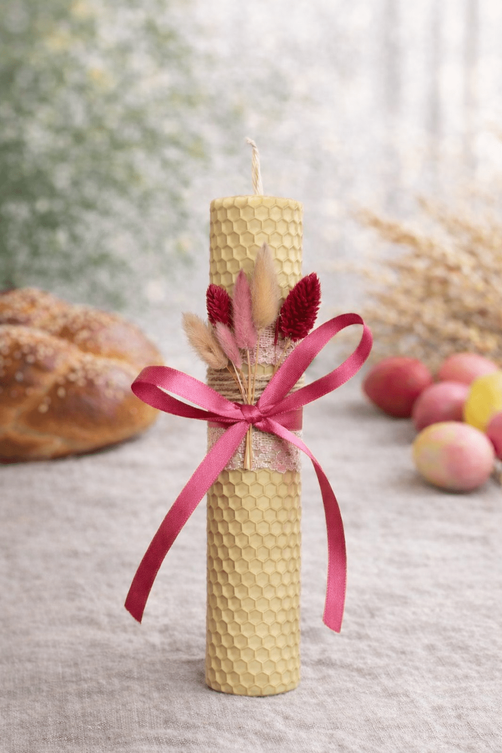 Χειροποίητη λαμπάδα από αγνό μελισσοκέρι, στολισμένη με αποξηραμένα άνθη και συσκευασμένη σε κουτί δώρου. Μια όμορφη επιλογή για τη νύχτα της Ανάστασης ή ως συμβολικό δώρο.